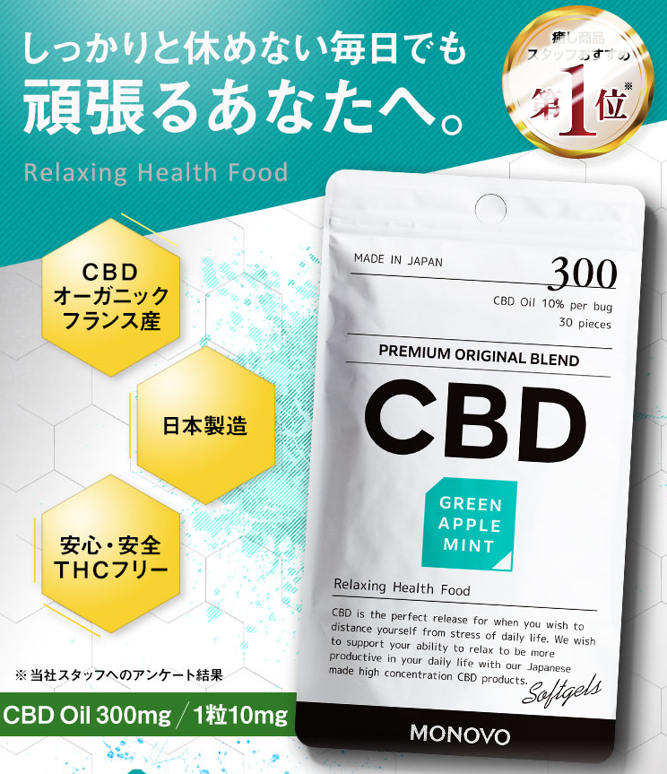 CBDは流行っている身興味を持っていて、初めてCBDを使用するのも不安があったんですが、これは何と言ってもオーガニックなCBDオイルが使われているのと、国内製造という点が魅力的で買いました。緊張する場面も多い職種なので、これで毎朝いつも精神を落ち着かせてから出かけています。とてもリラックスできます。